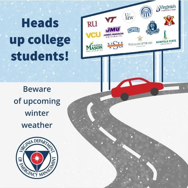 The Virginia Department of Emergency Management has also issued a warning for college students who may be driving back to school this weekend. All drivers should plan accordingly and check the forecast for their route. Follow @VDEM on Twitter for updates from the agency.
